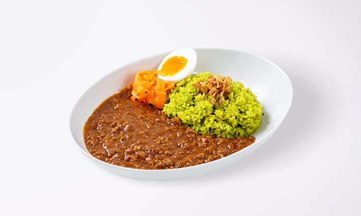 緑効青汁とターメリックを混ぜ込んだ雑穀米と、数種のスパイスの芳醇な香りが食欲を刺激する一品です