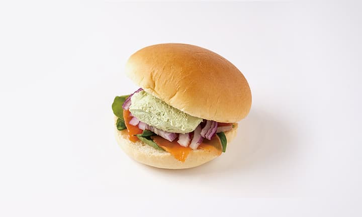 燻製の香りが豊潤なスモークサーモンと、青汁を練り込んだ優しい酸味のクリームチーズをふんだんに使用した絶品バーガーです。